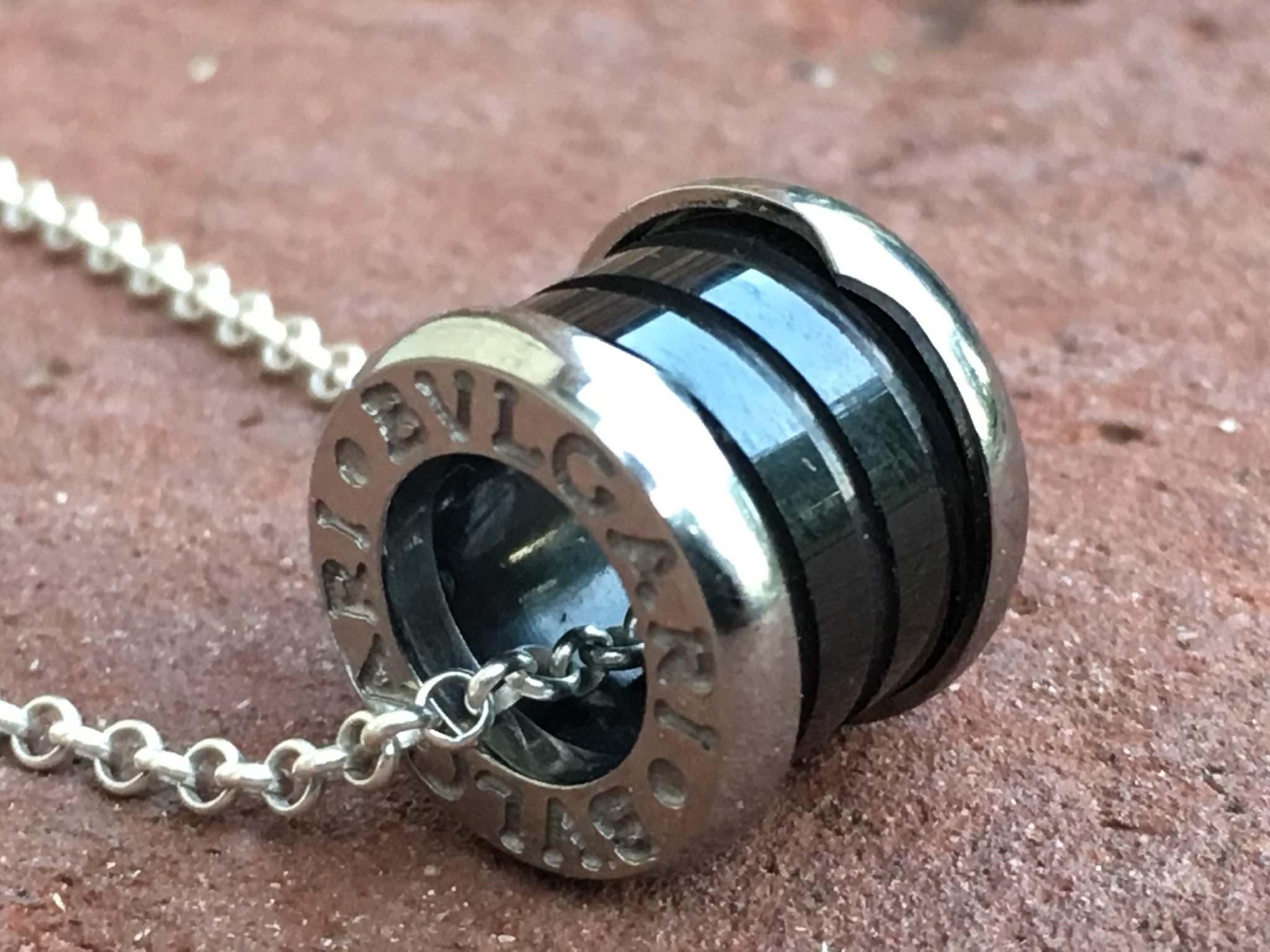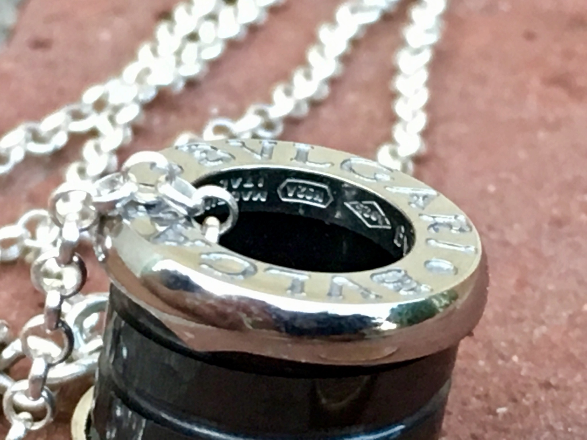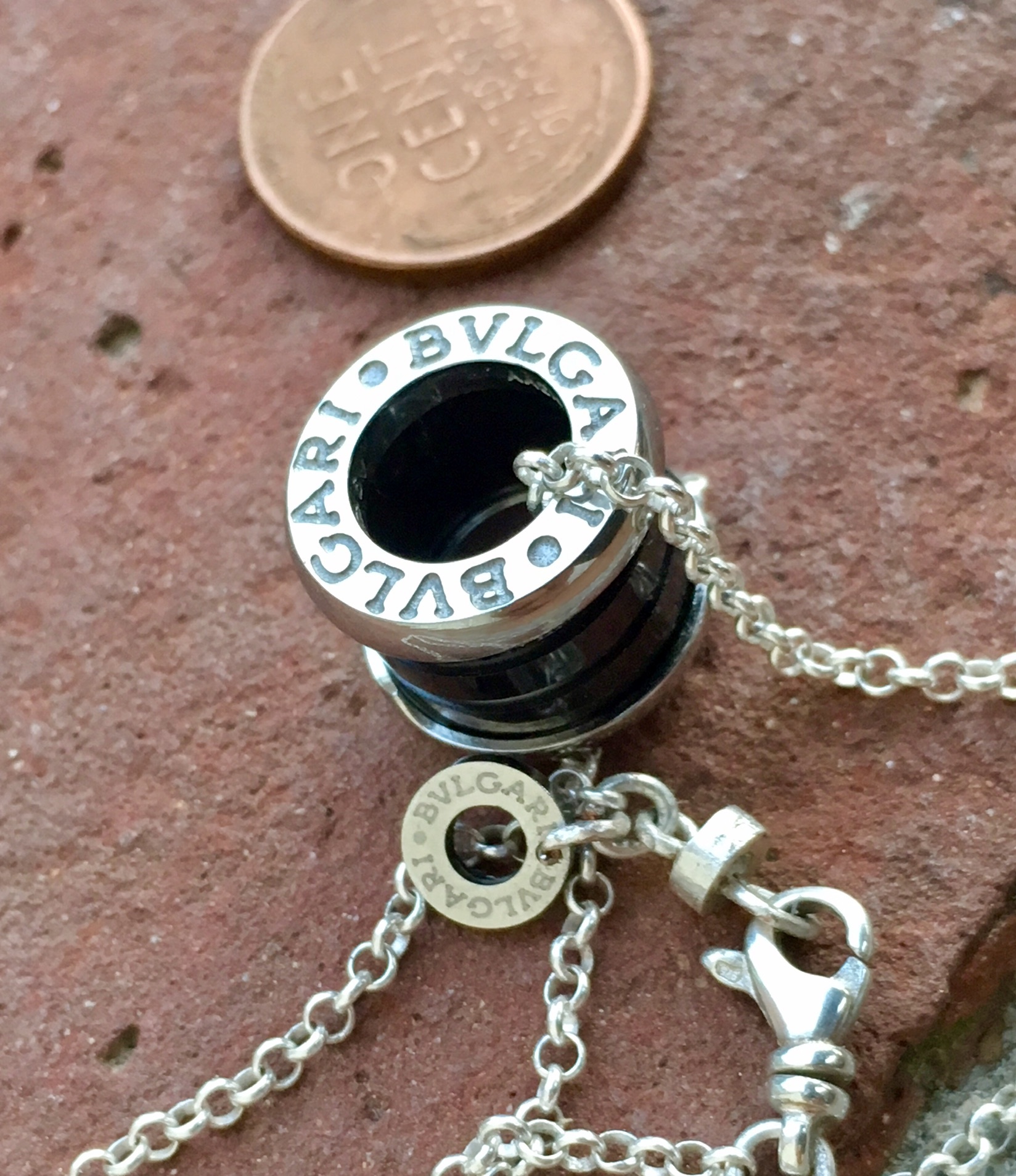 This listing is only for the Bvlgari pendant. It is fully hallmarked and guaranteed authentic Bulgari. Unfortunately I had a customer who had lost their original Bvlgari chain necklace so I sold the one that came with this one. It is made of black ceramic and solid 18kt white gold stamped 750. A classic piece that is timeless and goes with everything!