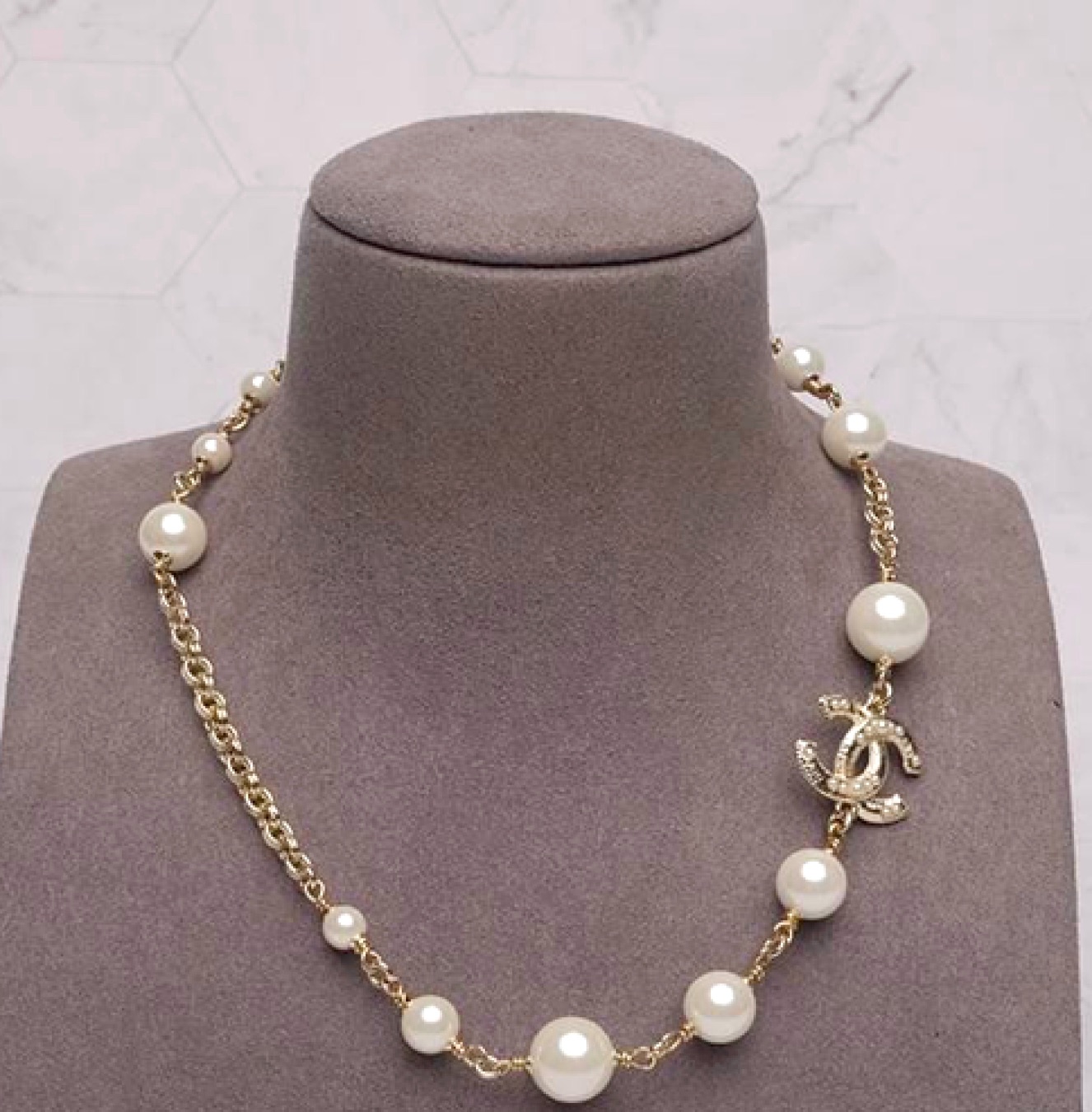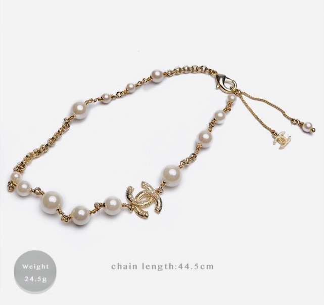 This Chanel necklace measures 16.5 inches in length with an adjustable 2 inch extender. It is from. 2020 and is champagne gold with white faux pearls. It literally goes with every outfit whether casual or dressy. It’s always got class. Shipped with free priority shipping and guaranteed authentic.