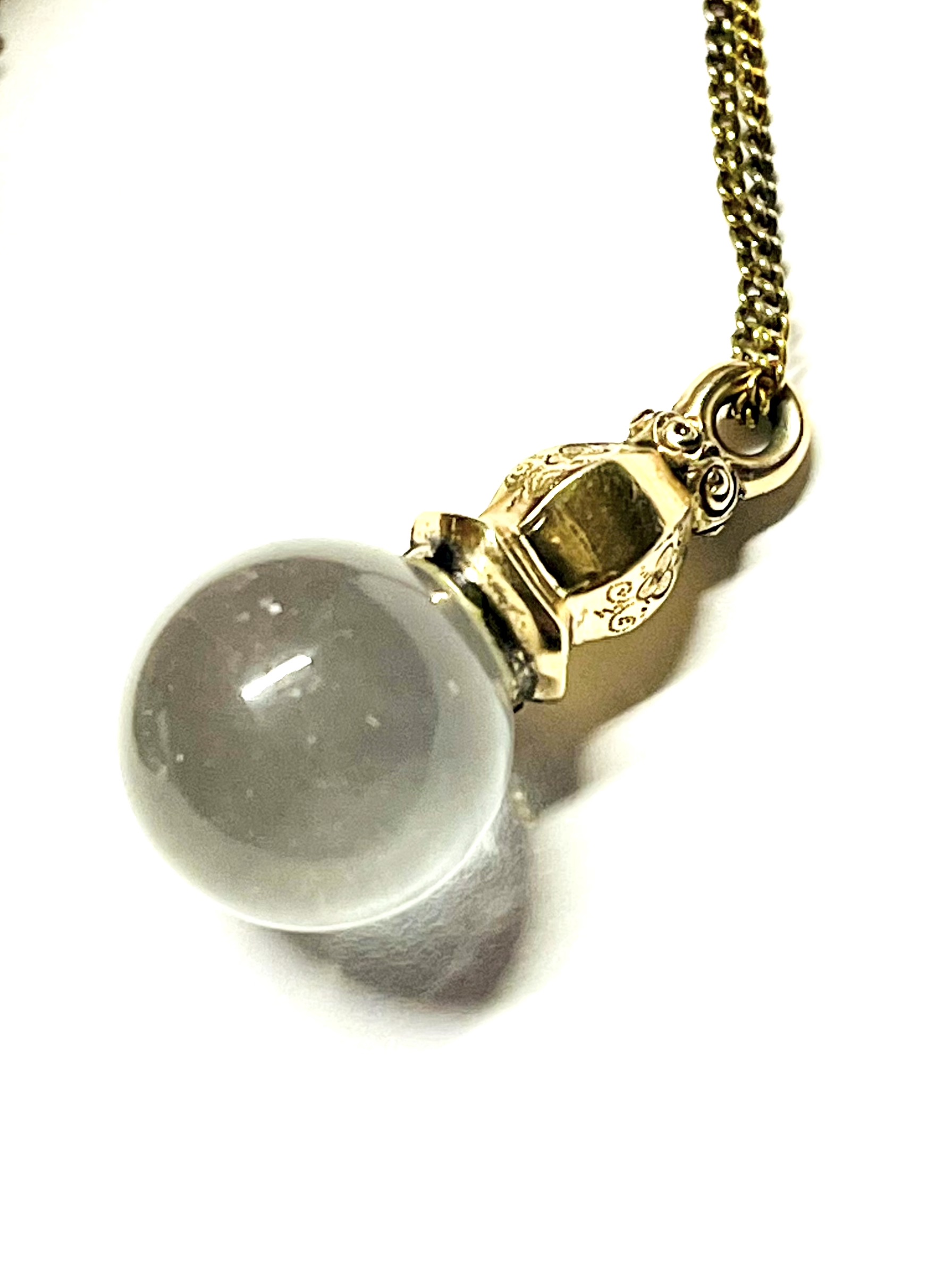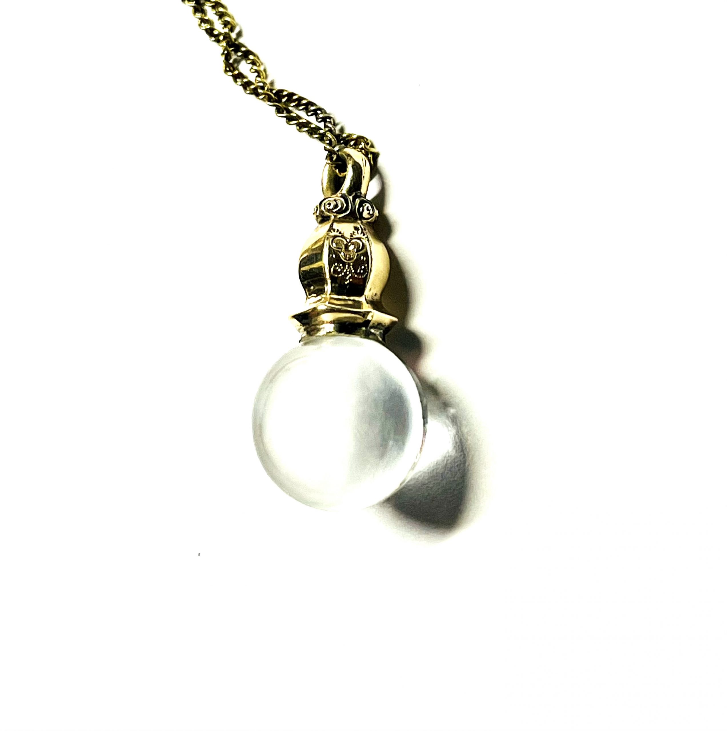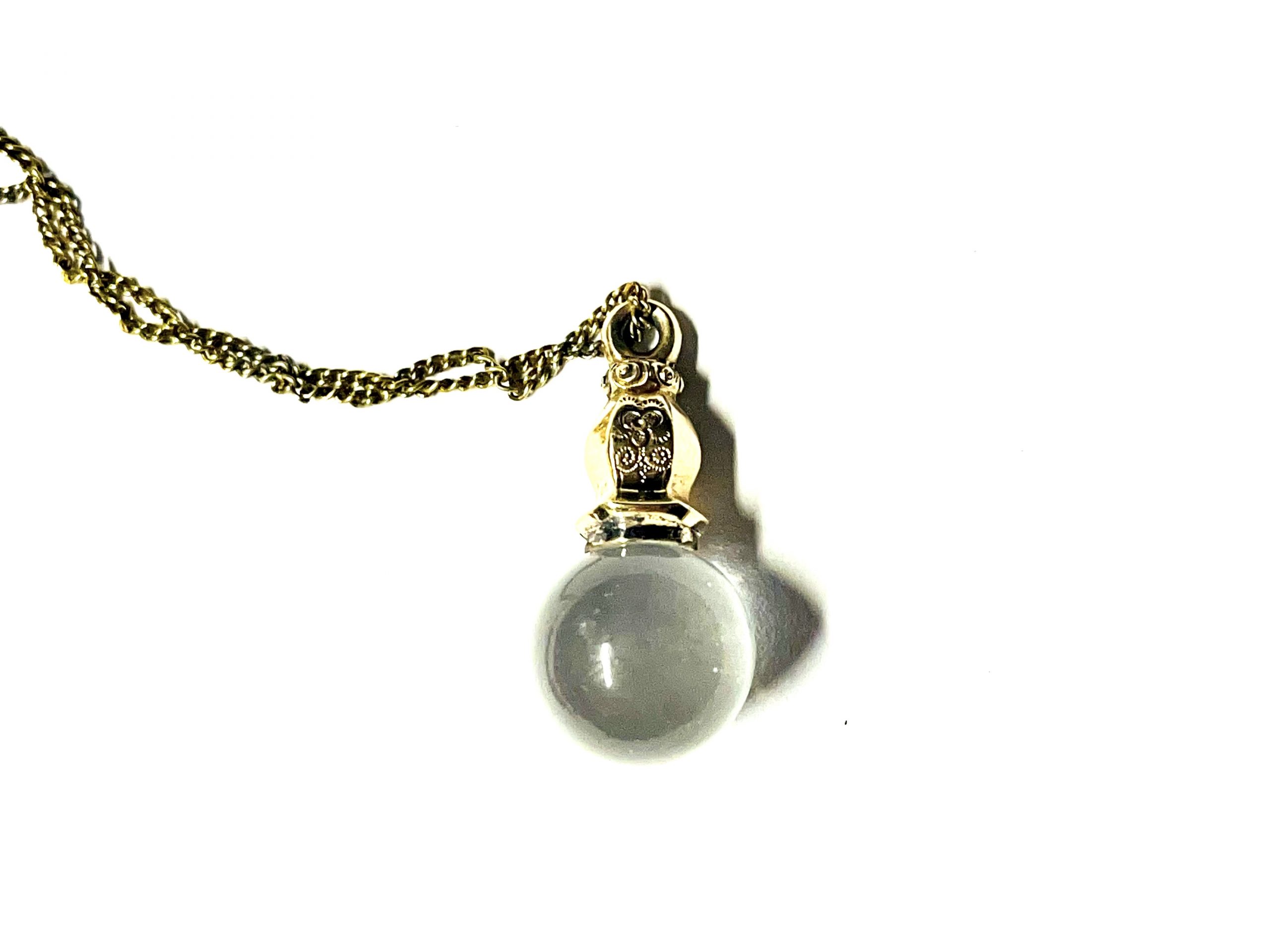This is a one of a kind Momento Mori Pool of Light Necklace necklace. It features a gold momento mori end piece that used to hold a beloved ones hair. A quartz crystal has been added to have a pool of light keepsake. Hung on a vermeil gold chain. Measures 18 inches in length.