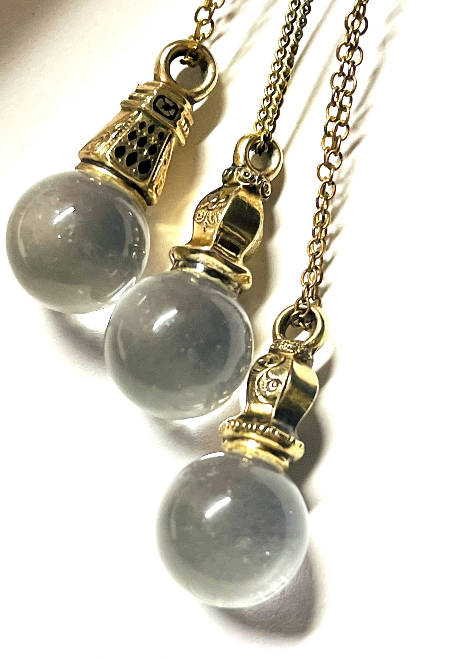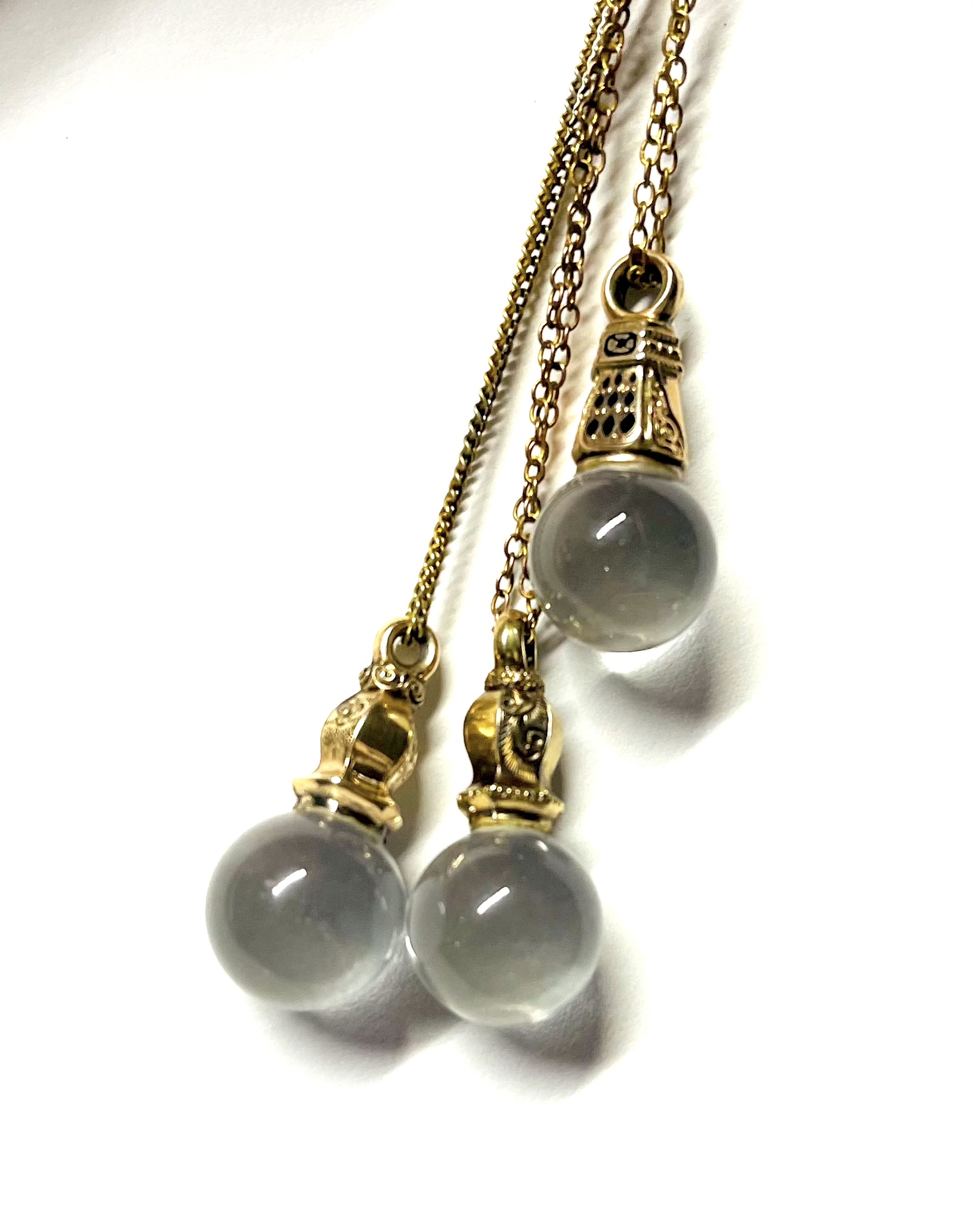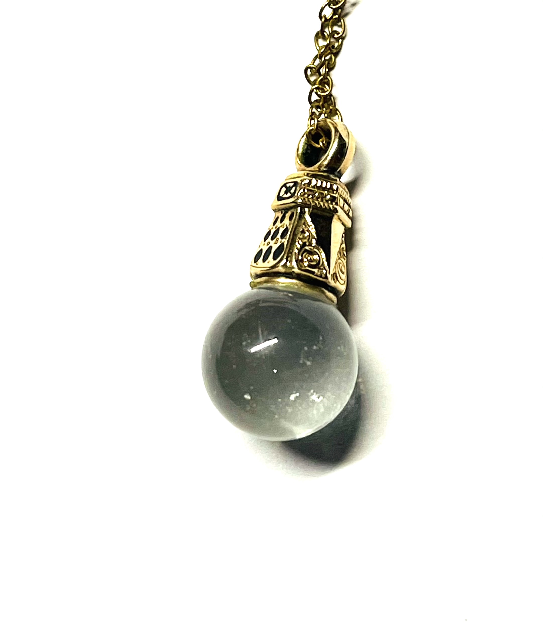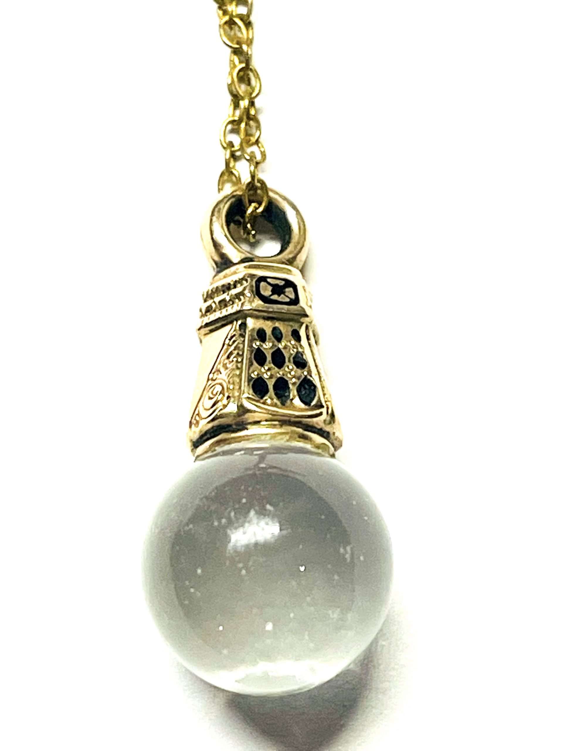 One of a kind 18 inch long gold pool of light Momento Mori Necklace. Features a gold momento mori hair end piece from the late eighteen hundreds. Attached is a quartz pool of light or sphere.