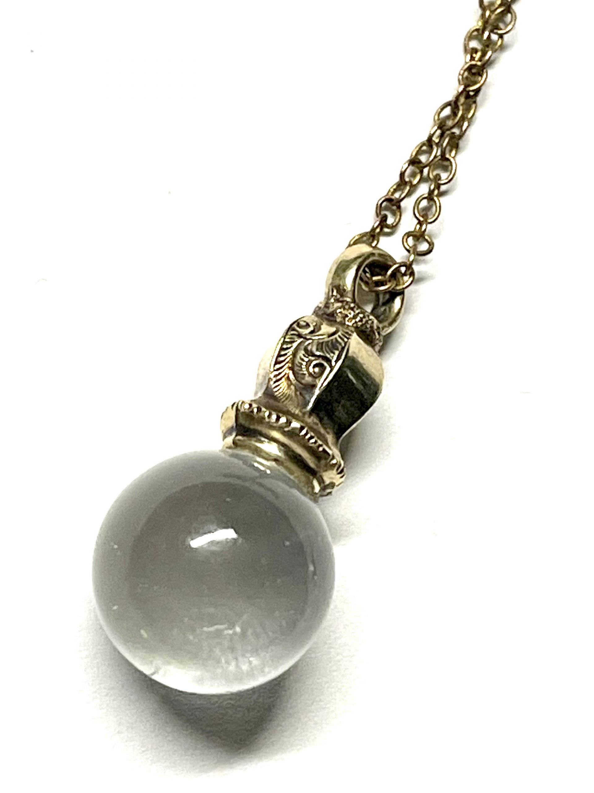 One of a kind 18 inch long gold pool of light Momento Mori Necklace. Features a gold momento mori hair end piece from the late eighteen hundreds. Attached is a quartz pool of light or sphere.