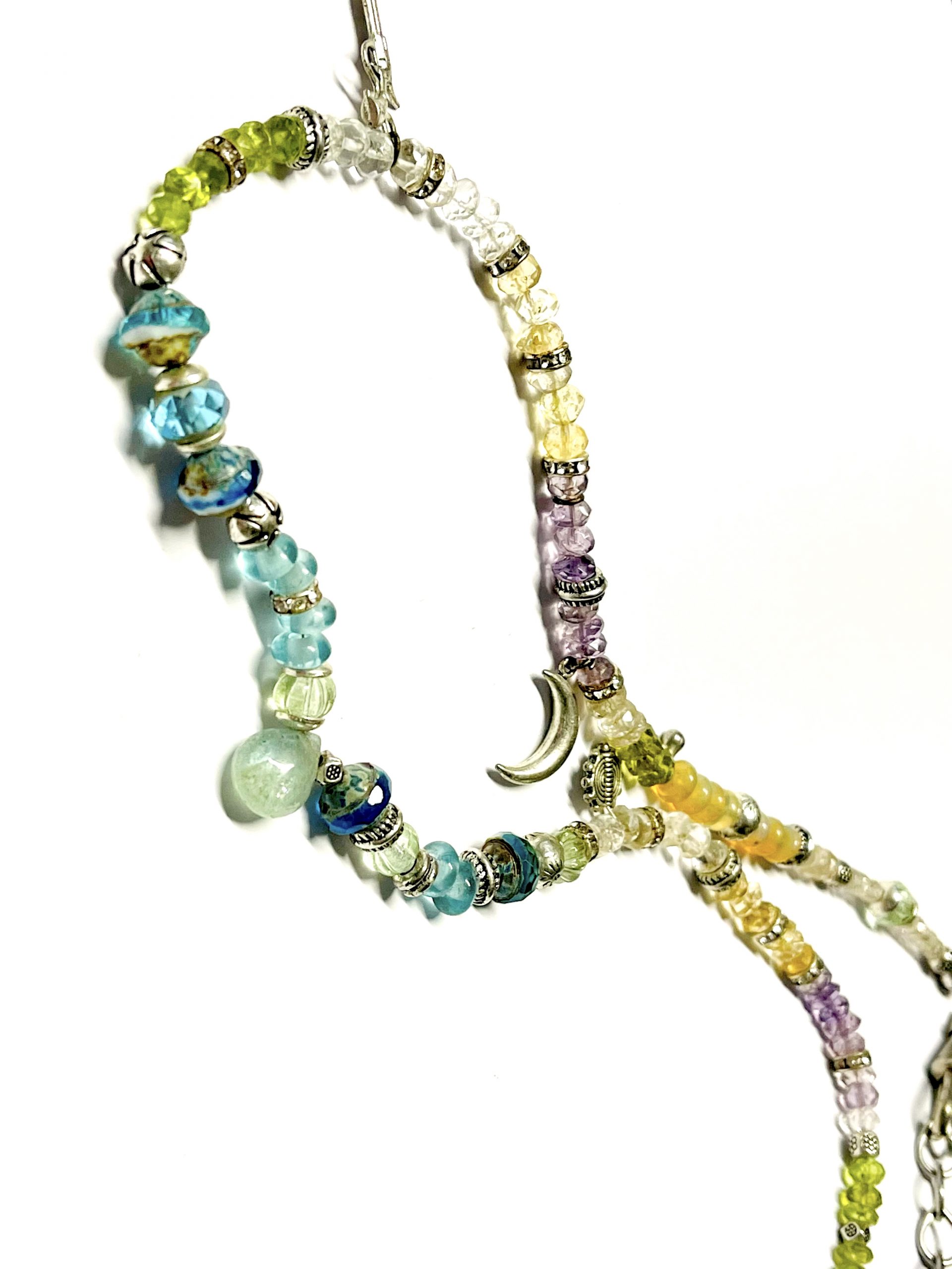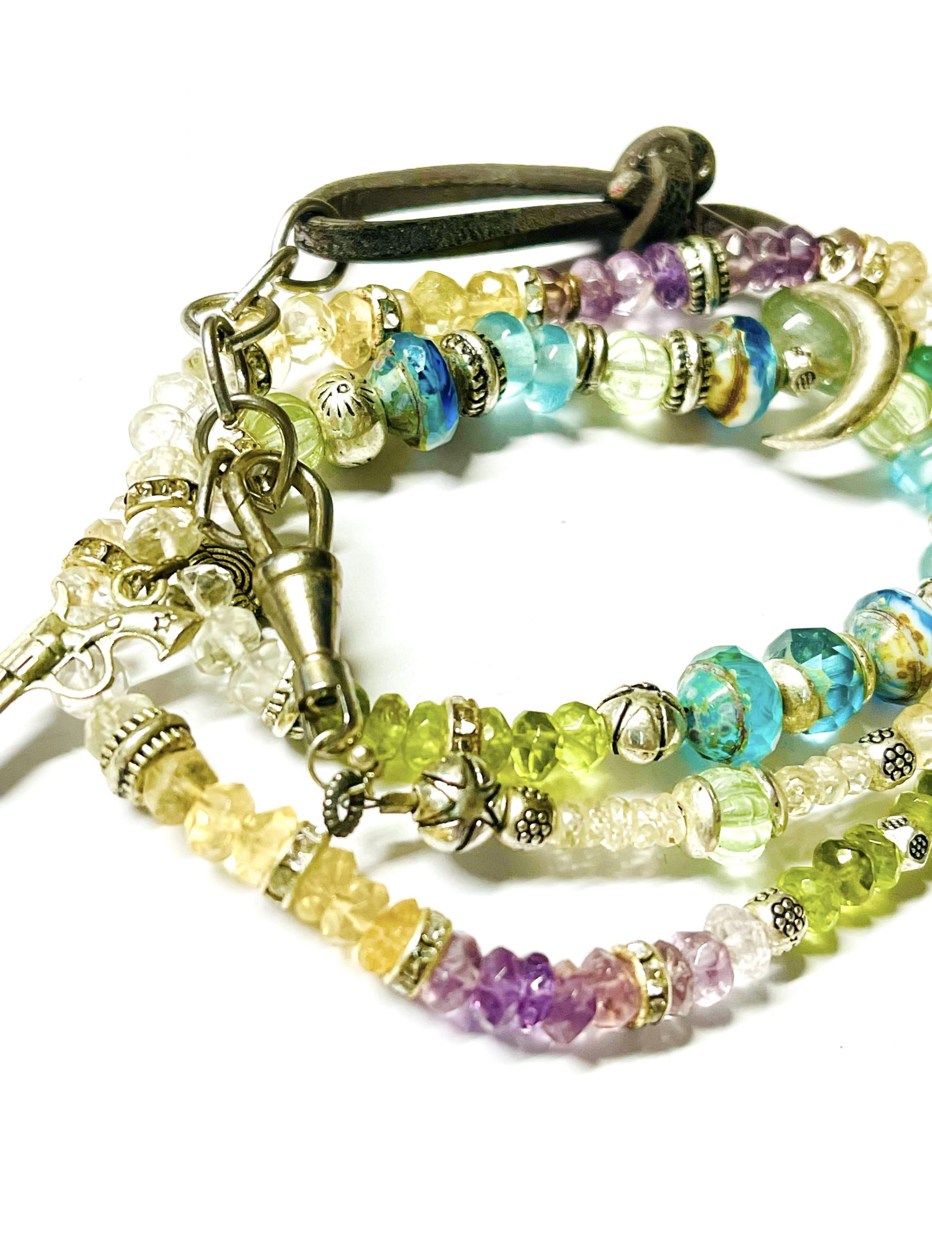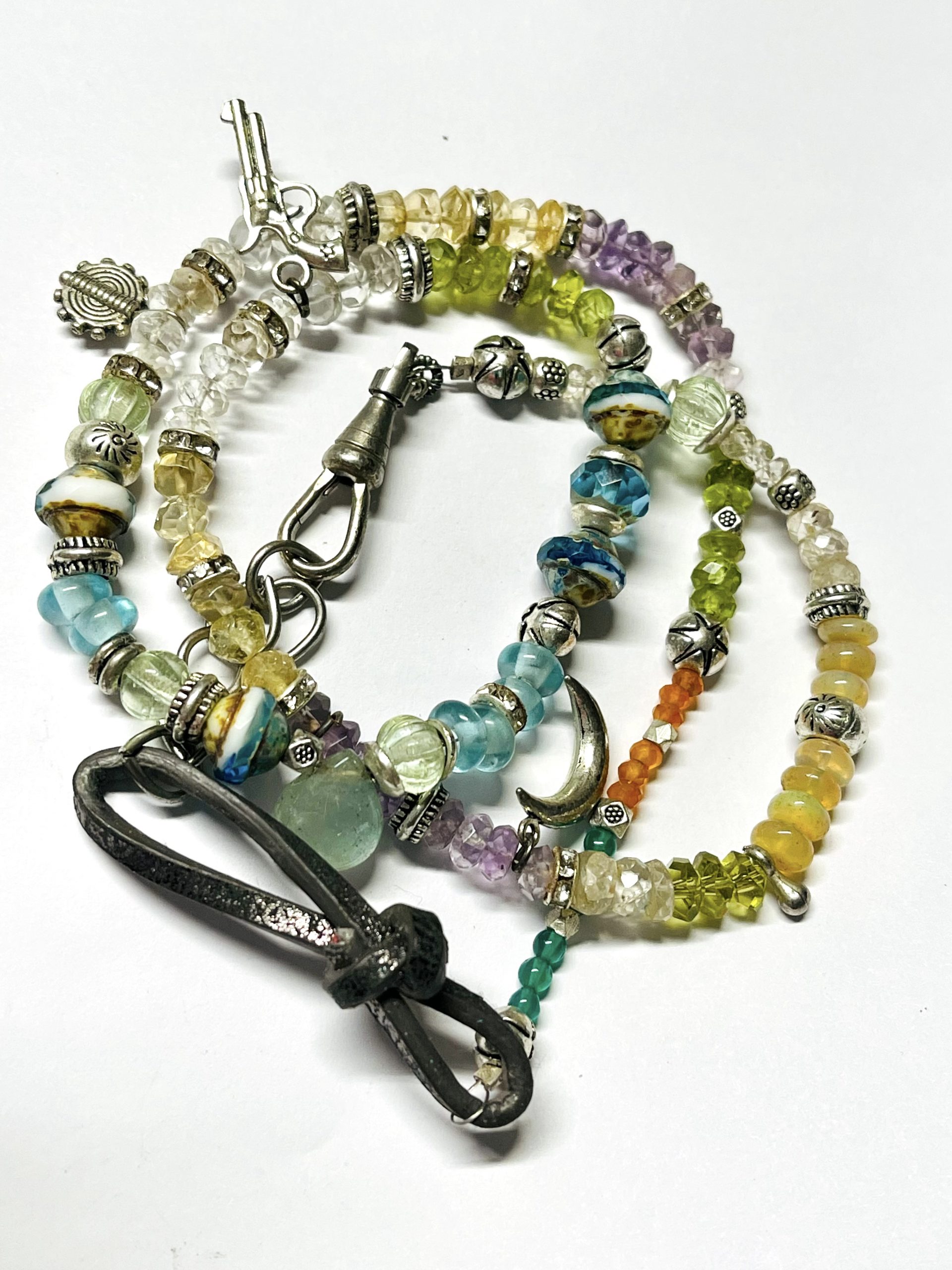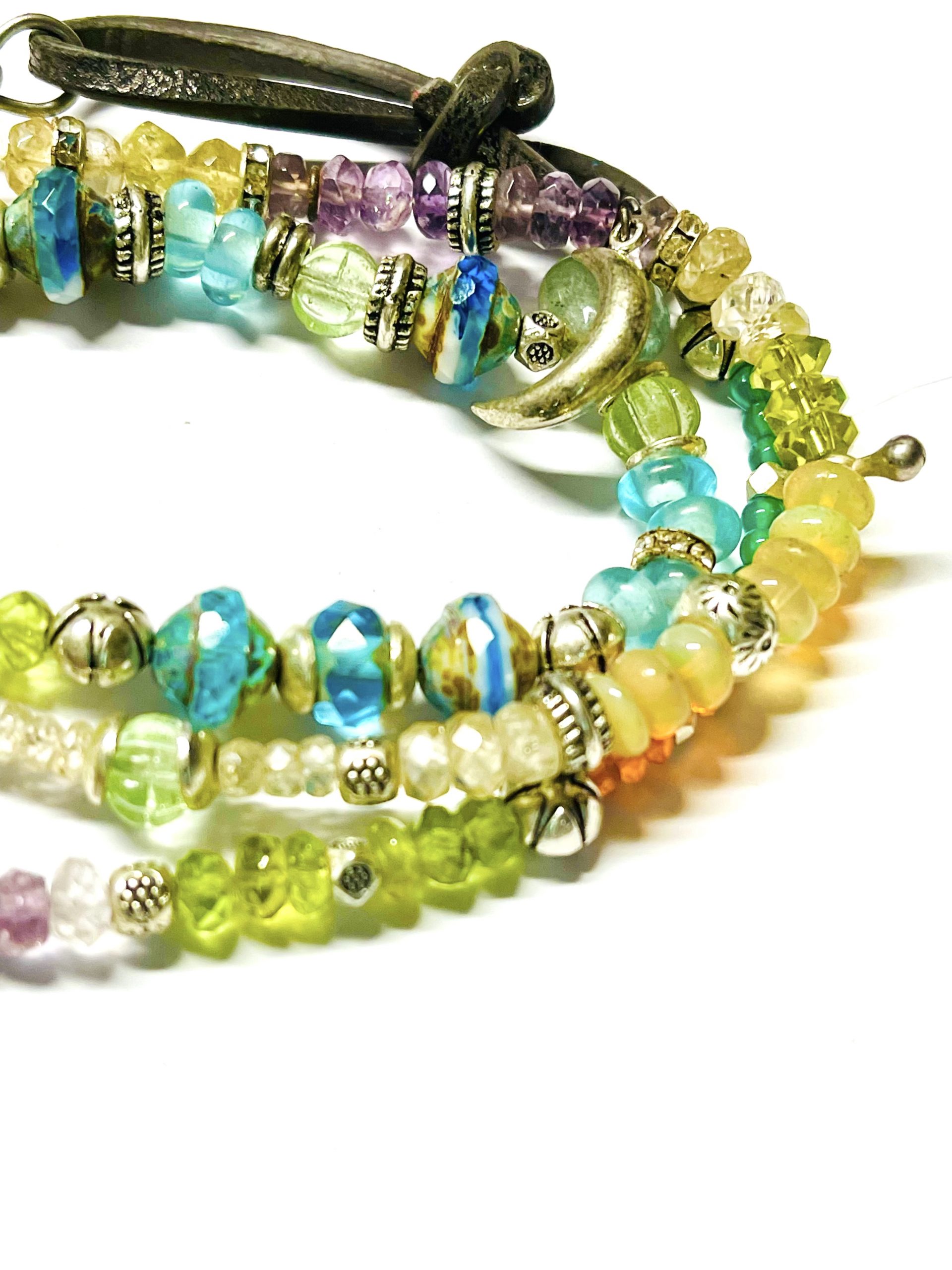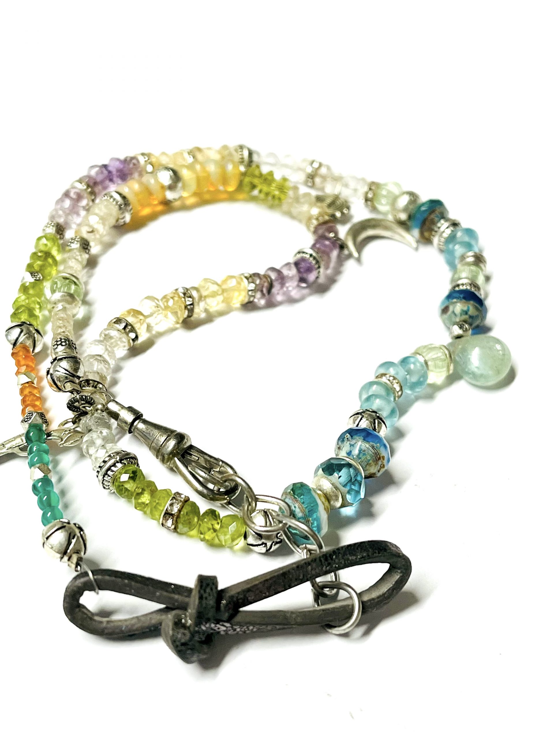 This is the most excellent gemstone Boho Bracelet I have ever made or seen. It is gorgeous. It is made with mostly rainbow-coloured sapphire faceted gemstones and light blue turquoise. It is a wrap of 3 or 4 strands or a fabulous necklace you choose. It would absolutely go with everything and is so trendy right now. The clasp is leather so it’s super comfortable and adjustable. I think it is soooo beautiful and hope you will as well.