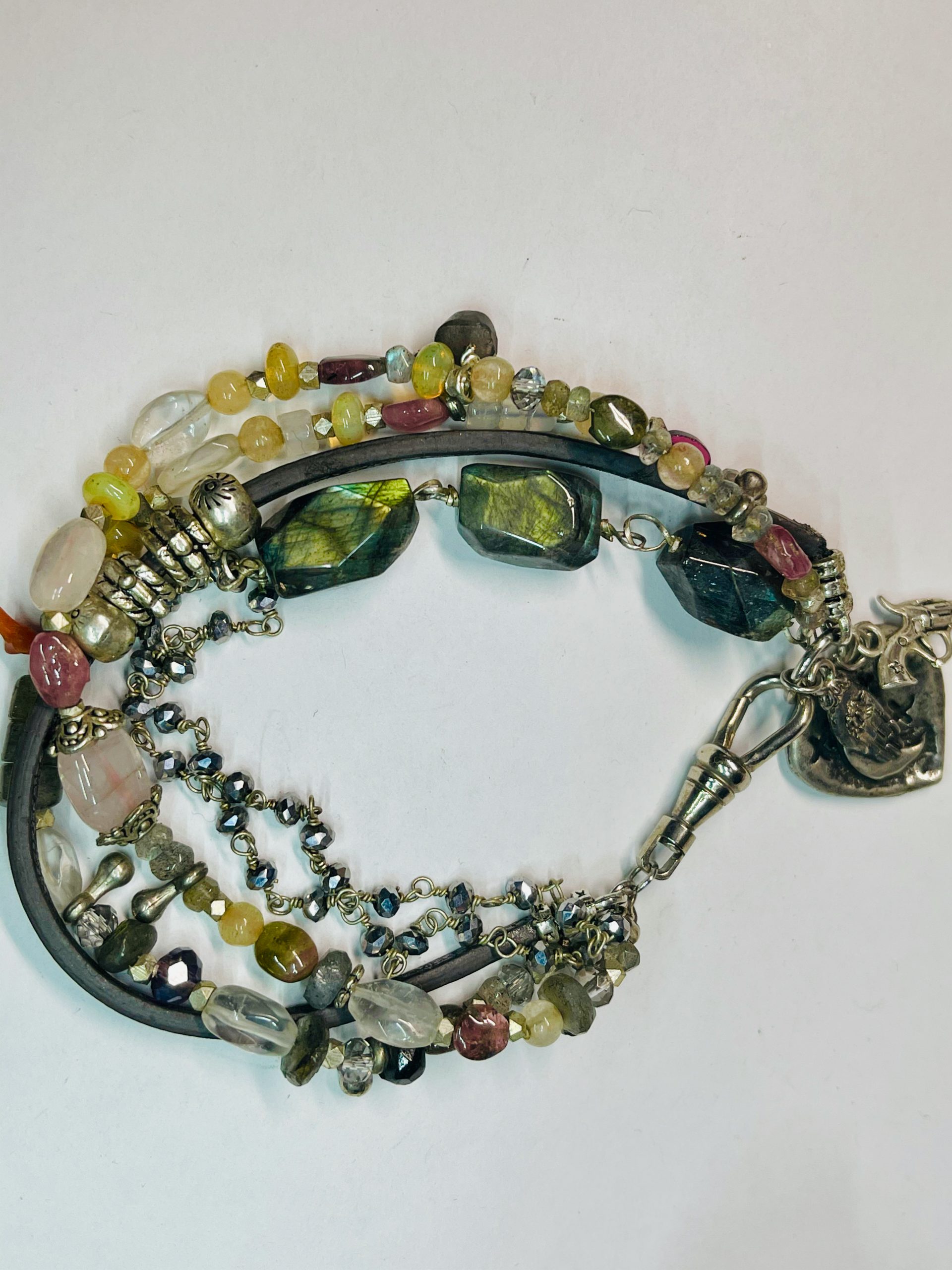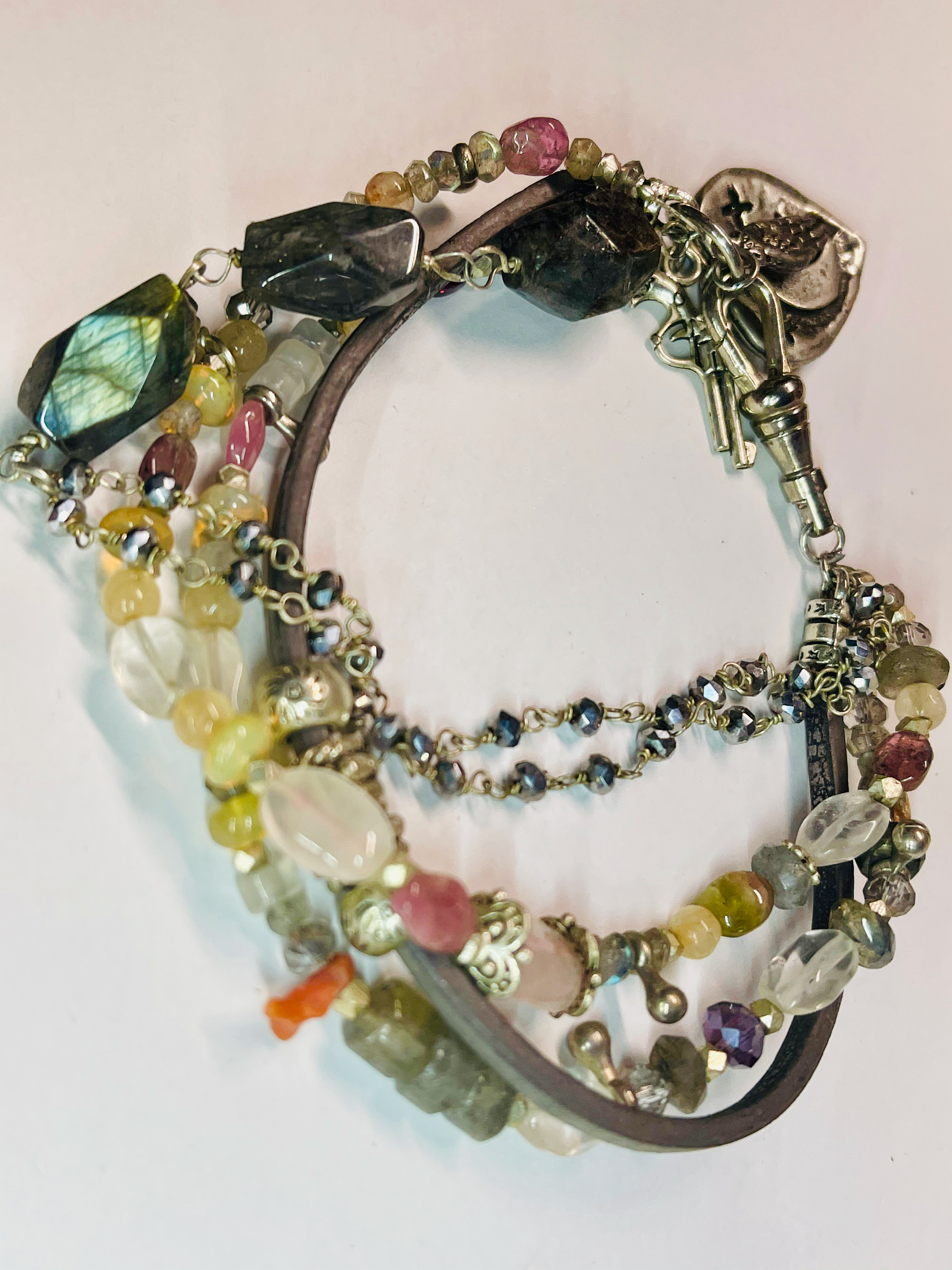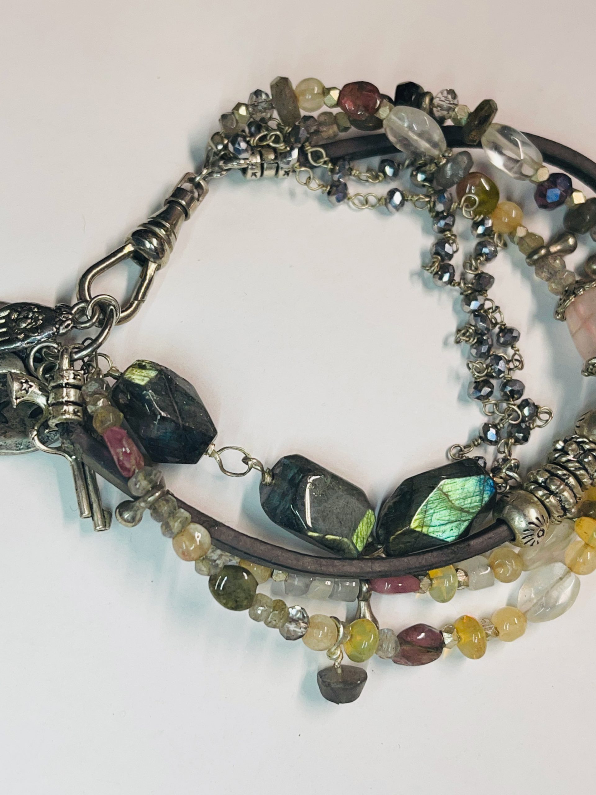 This Real Natural Gemstone Bracelet is made of of 4 strands of real gemstones like opals, citrine, quartz, topaz and more. Don’t let the pretty muted colors fool you its gorgeous! Especially the larger hex shaped labradorite. I only used ones with intense blue and green flashes. There is also a strand of natural metallic silver leather for added texture. It has at least 3 sterling charms on it at the clasp which is very secure. I made it and its built to last. If you haven’t seen our collection of handmade Crolius jewelry