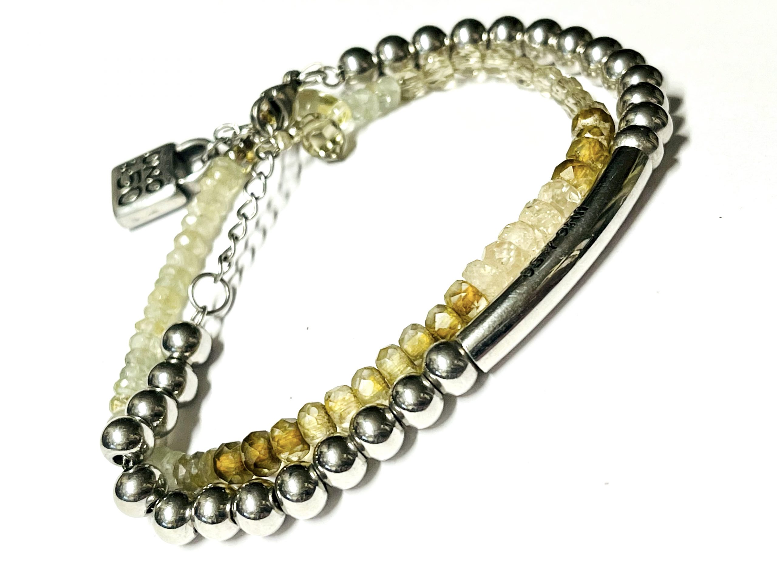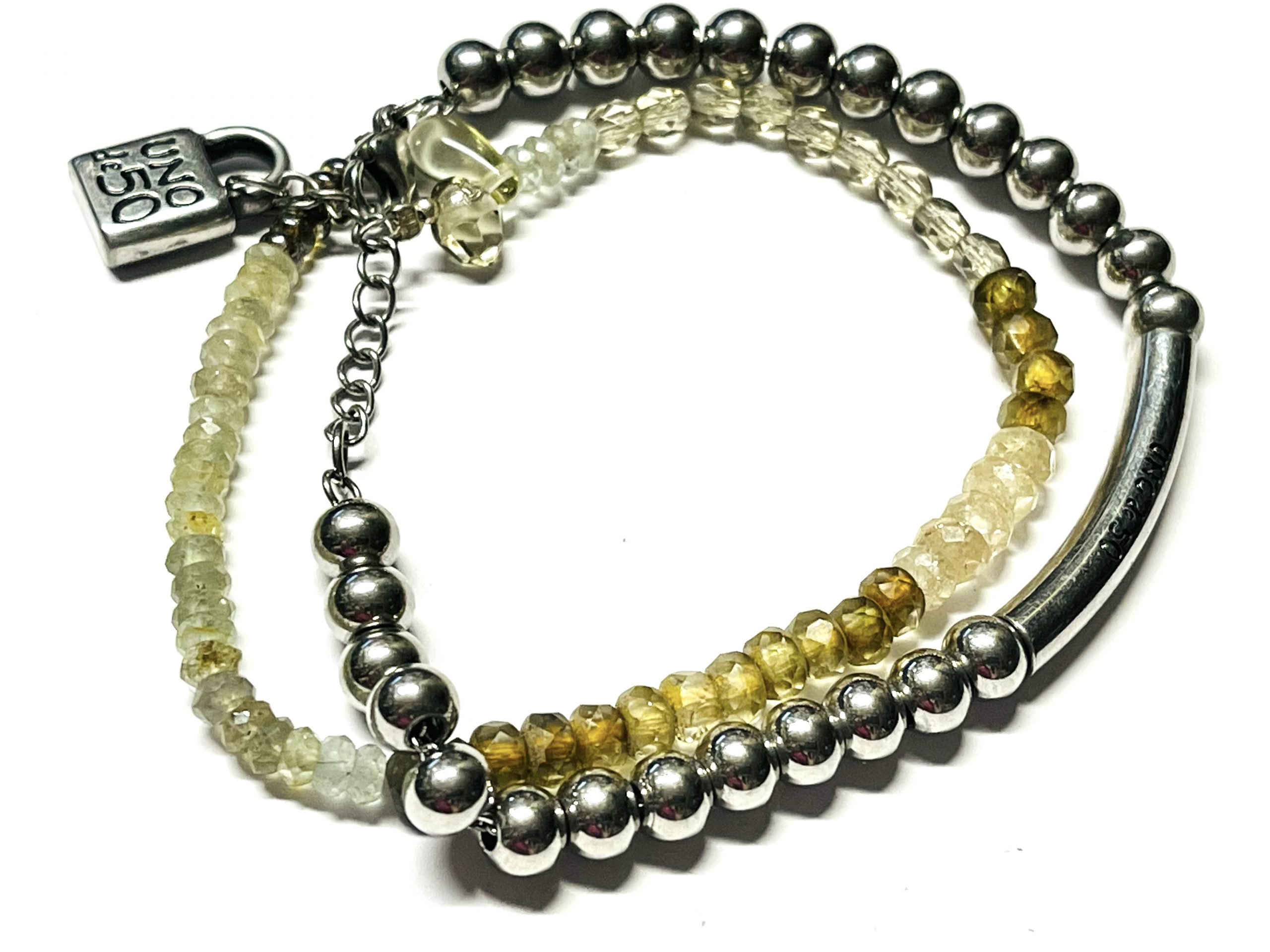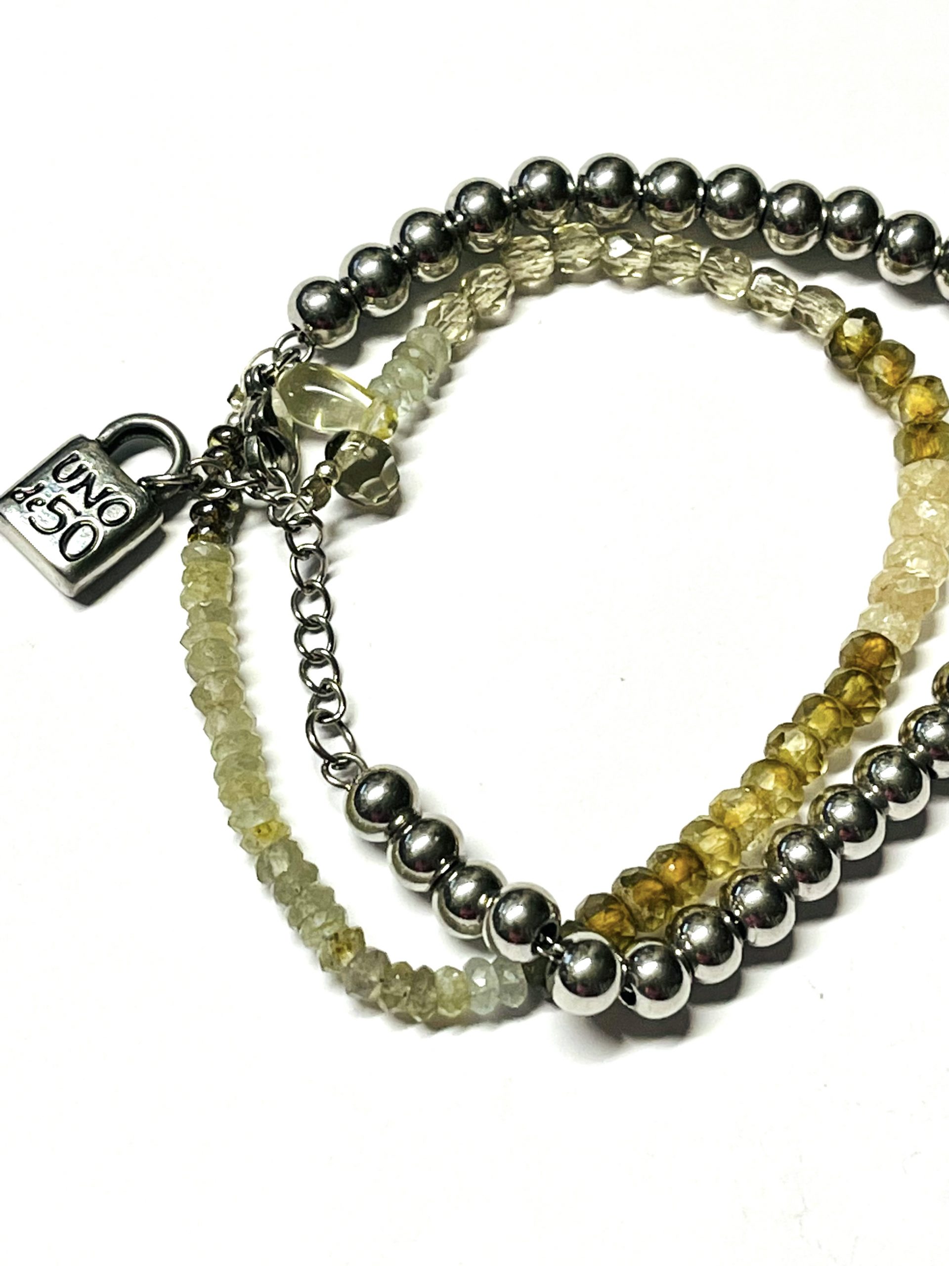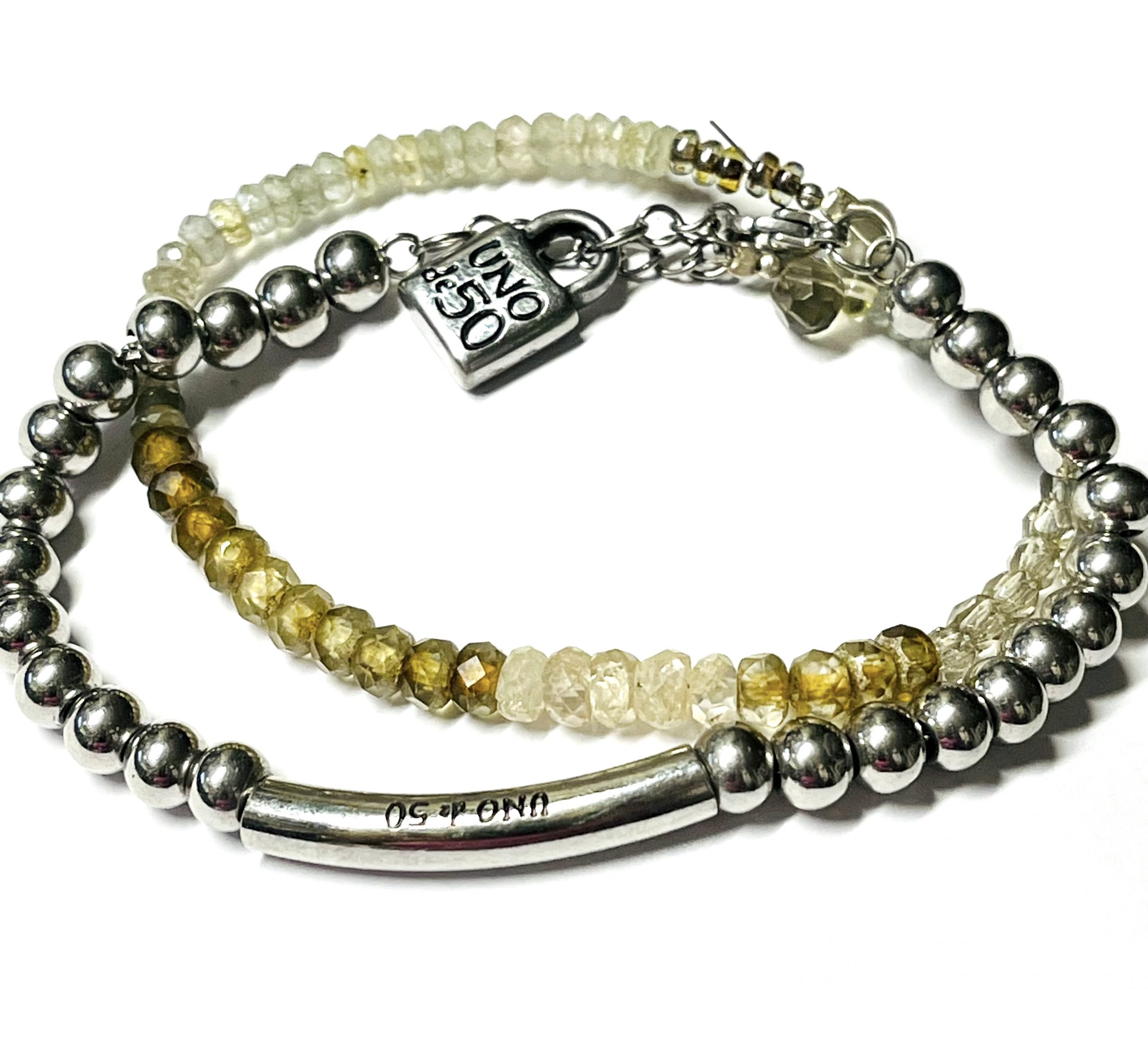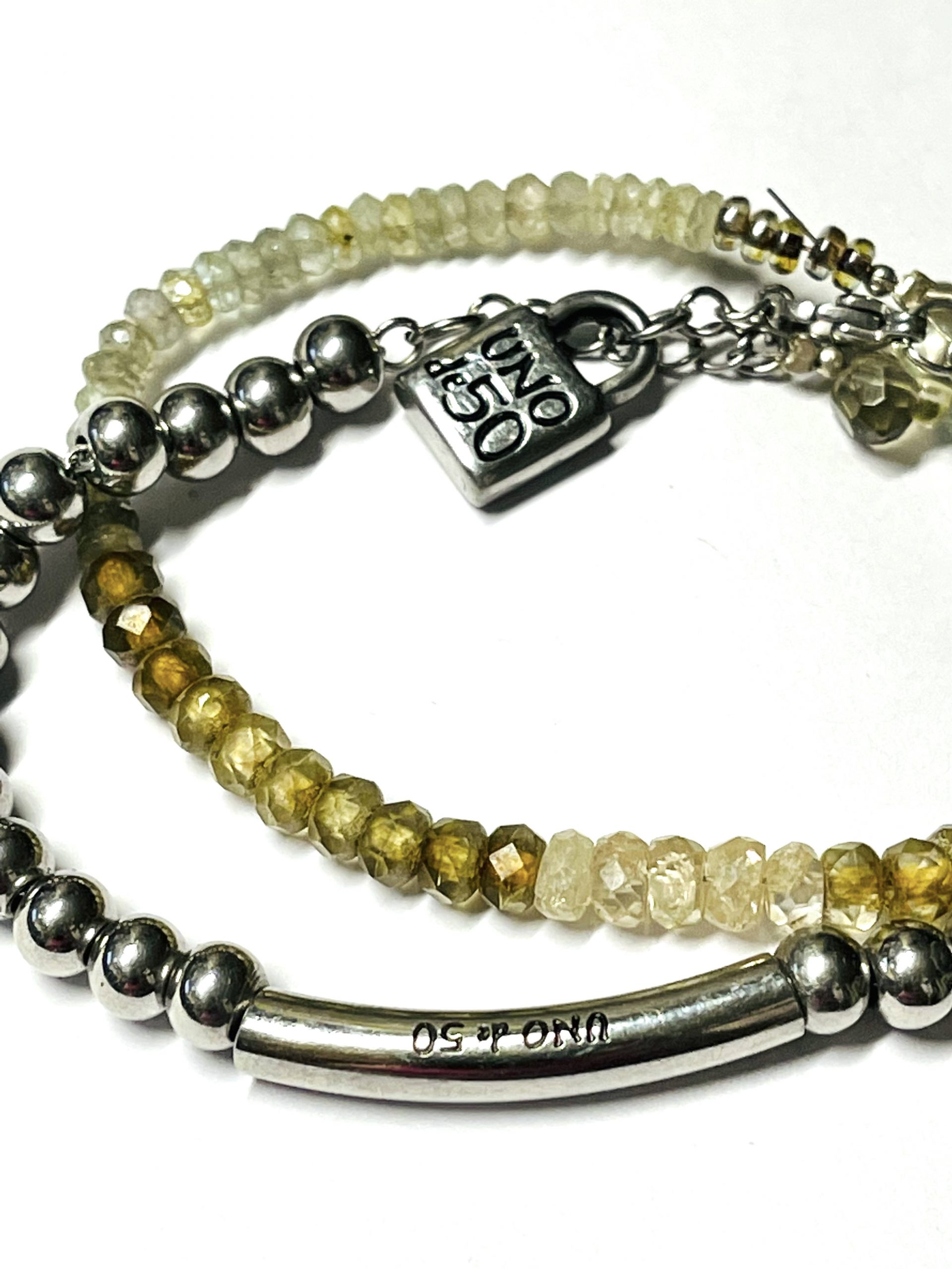 This started out as a Uno de 50 bracelet that was just too boring for me so I embellished it with another strand of faceted ombre gemstone beads in browns and greens. I think it is fabulous now with the added sparkle. It is signed in two places by Uno de 50. I have not worn it since I made it. It fits most wrists and is adjustable about an inch so it should fit up to a size 9 inch wrist. Great for school or casual wear.